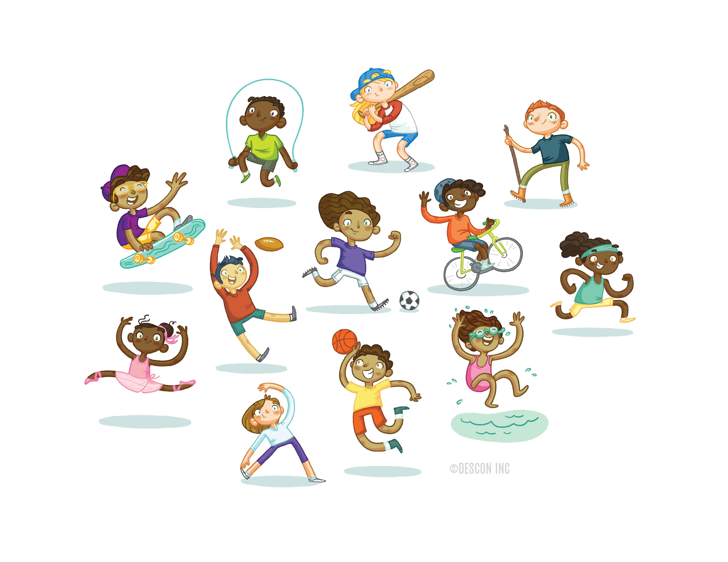 I was asked by Descon, Inc to create thirty characters that would get kids excited about healthy foods and exercise. The characters are being used on posters, banners, and other printed items to be utilized in the interior design of K-12 schools throughout the country.