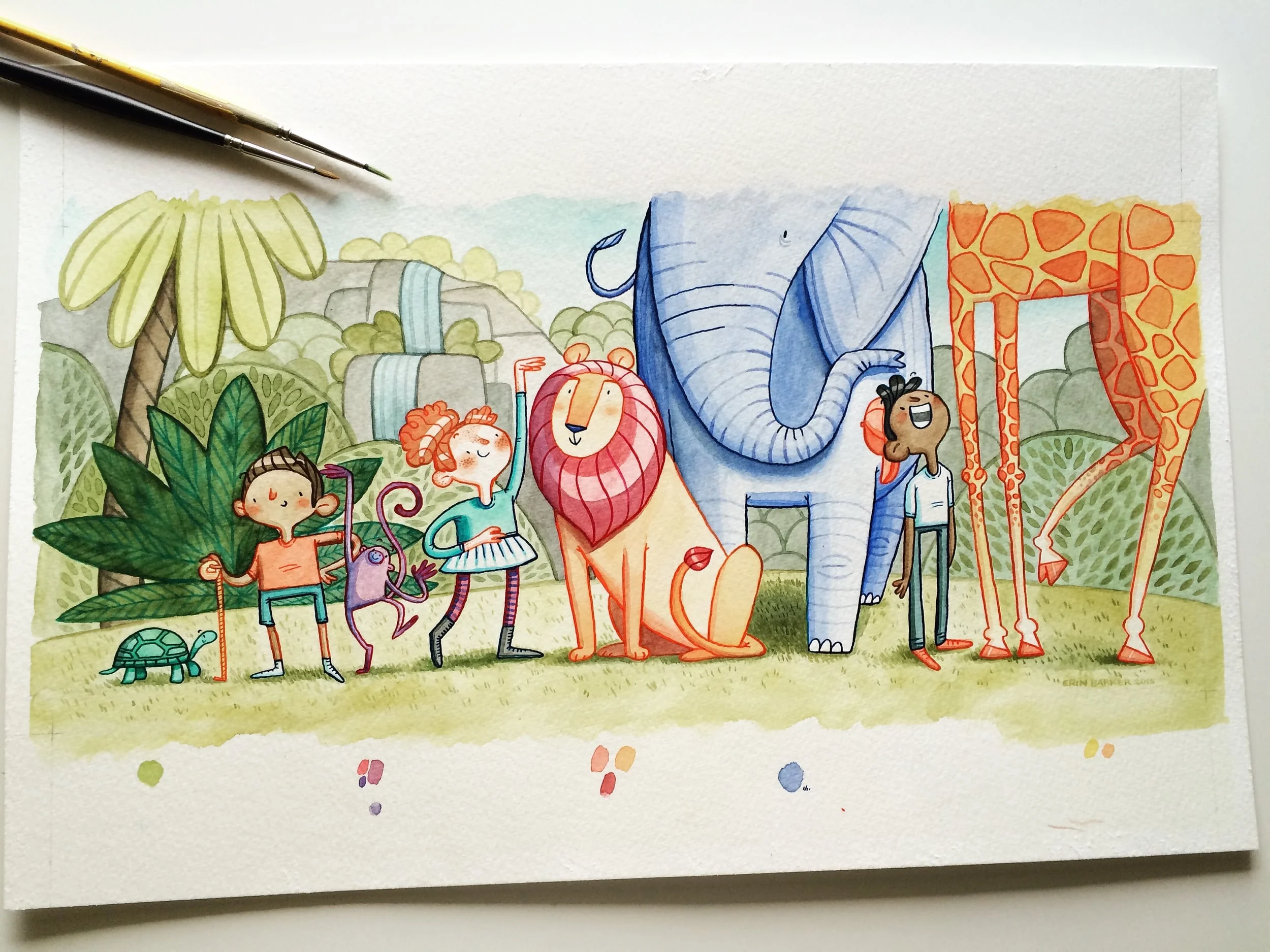 I was contacted by RockSkip Agency in Chicago to create 22 watercolor scenes for KinderCare's headquarters in Portland, OR. Pieces were enlarged to mural size and used for the company's conference rooms. Art direction by Geoff Allen.